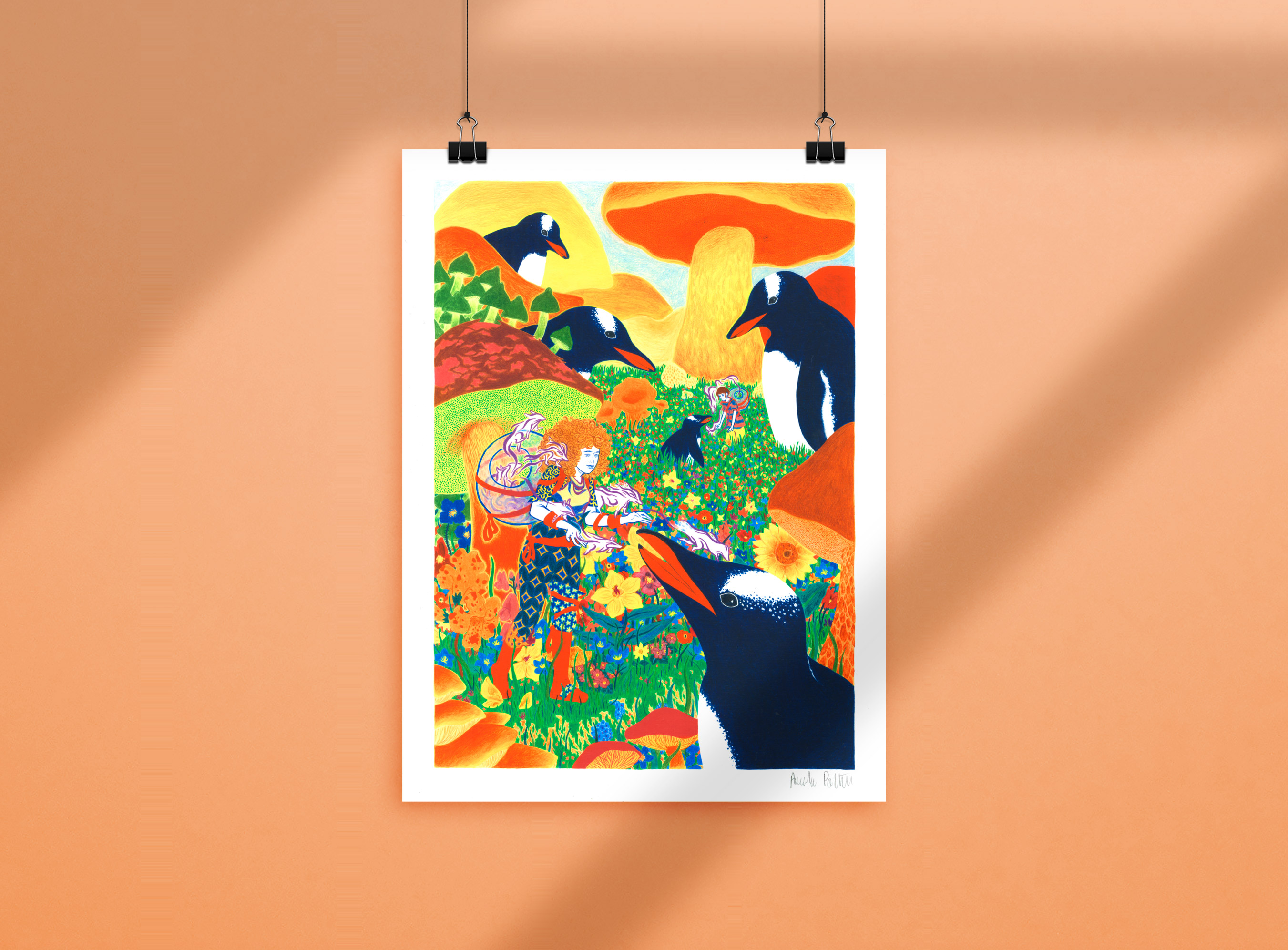 Il s'agit de la repoduction d'une scène de rencontre avec des manchots papou, dessinée originalement aux crayons de couleur.
