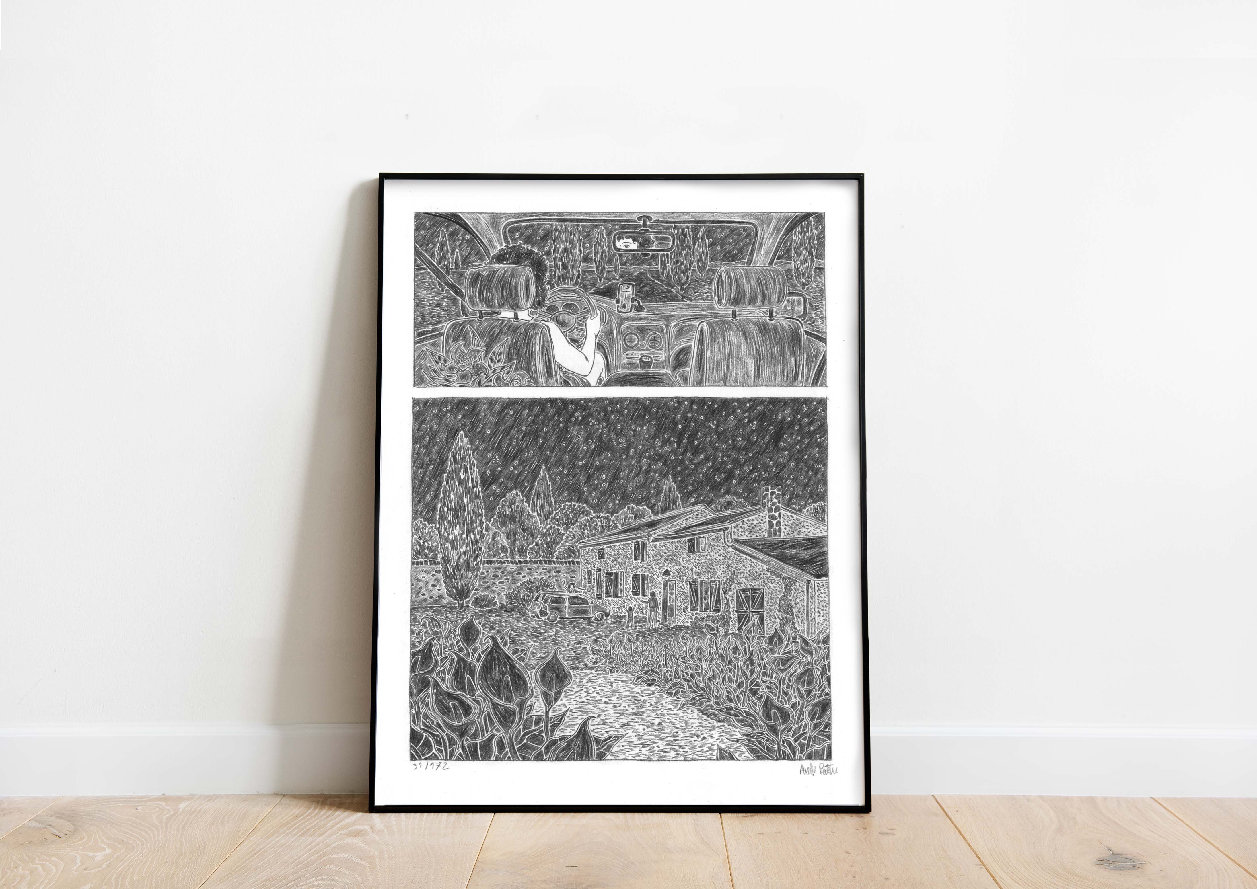 Ce dessin est la planche originale de la Page n°32 de la bande dessinée "Comme une fleur", sortie en mars 2025 chez Delcourt et scénarisée par Anne Baraou.