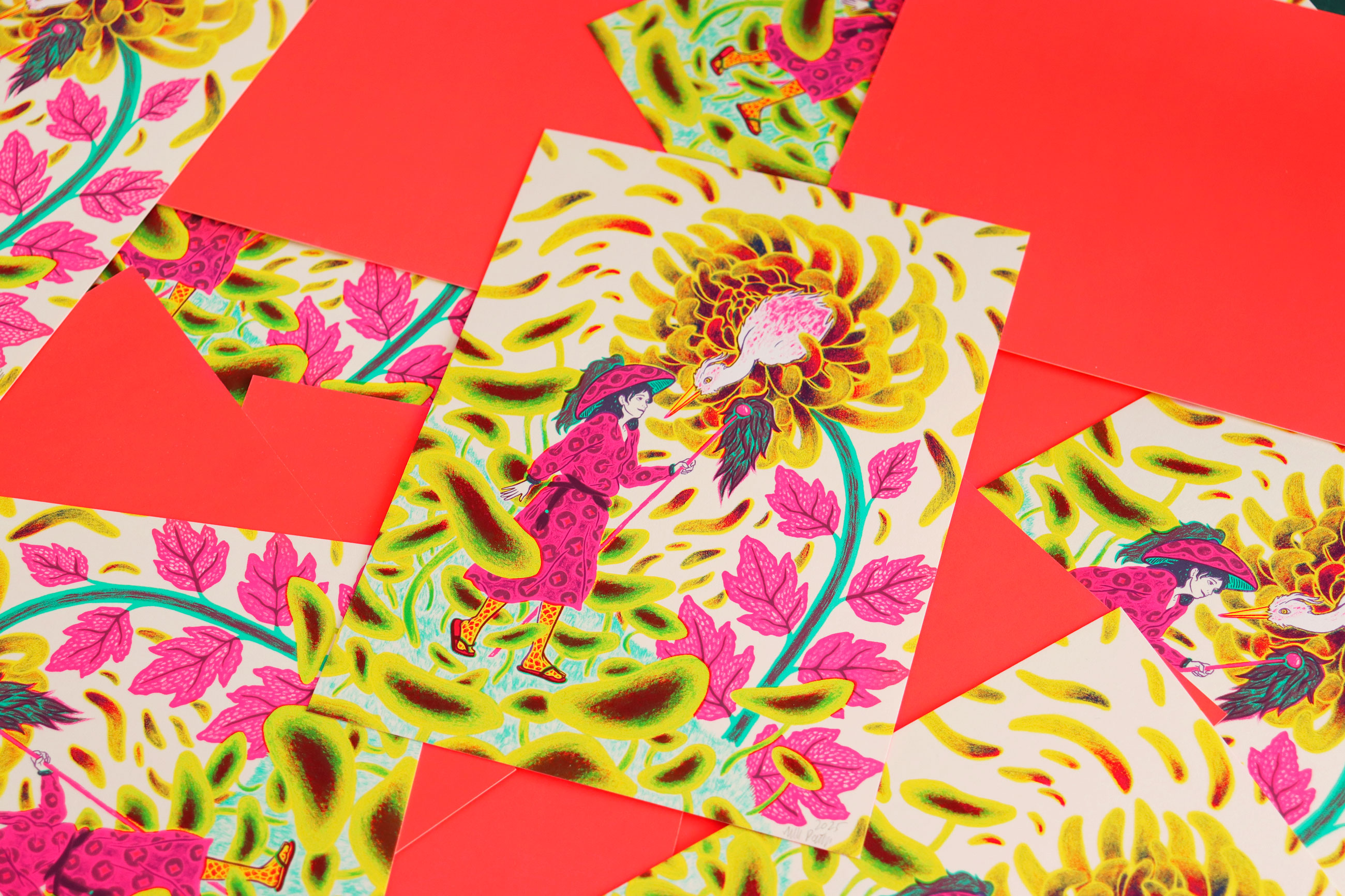 Impression sérigraphie 6 couleurs recto, 1 verso, sur papier Olin Colours Ivory 320g, 15 x 20 cm.