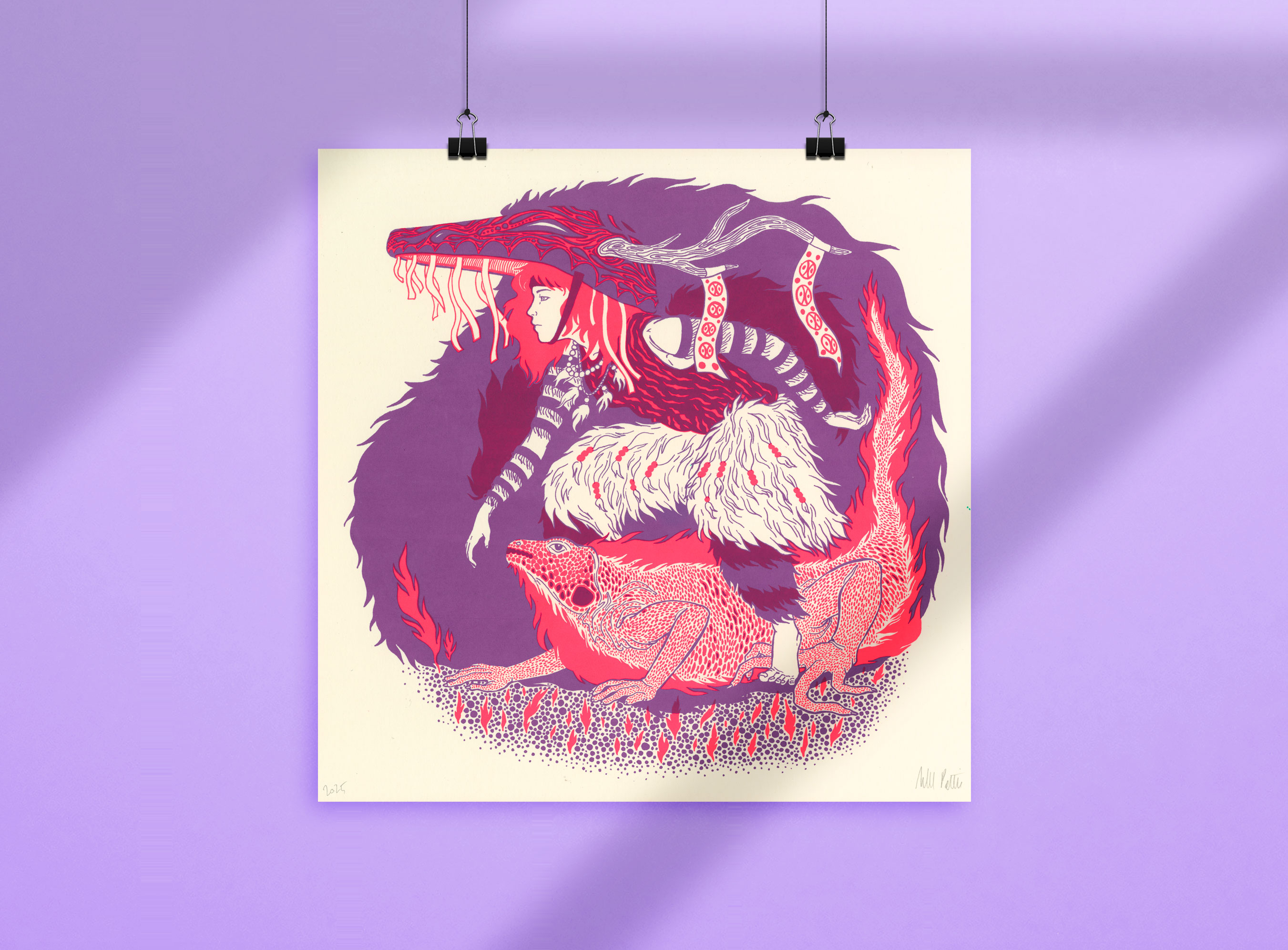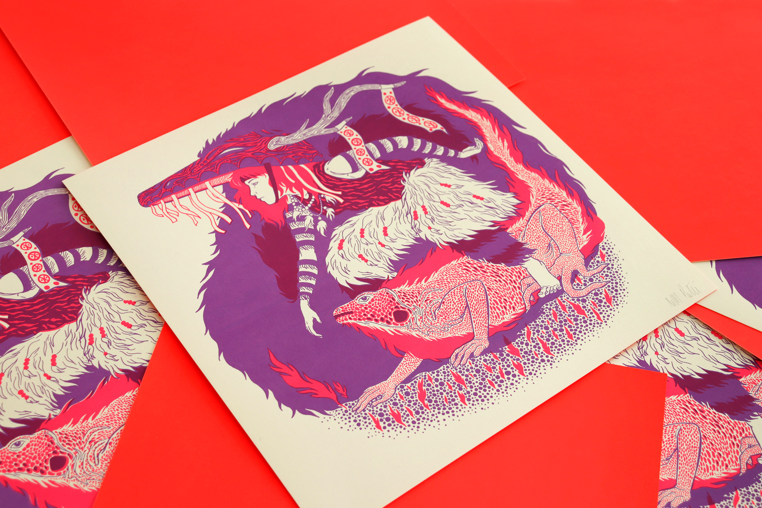 Impression sérigraphie 2 couleurs recto, 1 verso, sur papier Olin Colours Ivory 320g, 13 x 18 cm, signée.