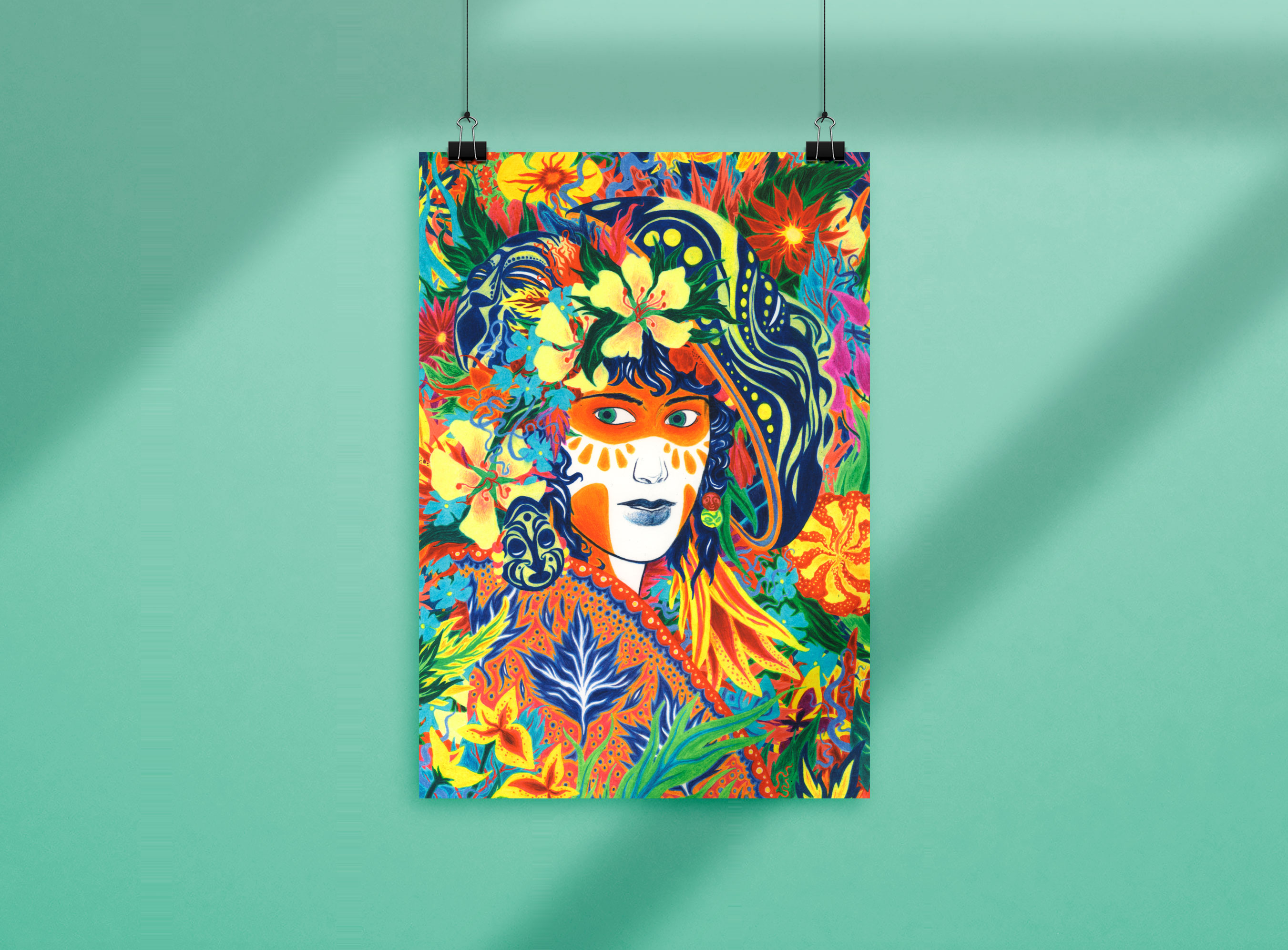 Il s'agit de la repoduction d'un portrait floral dessinée originalement aux crayons de couleur.
