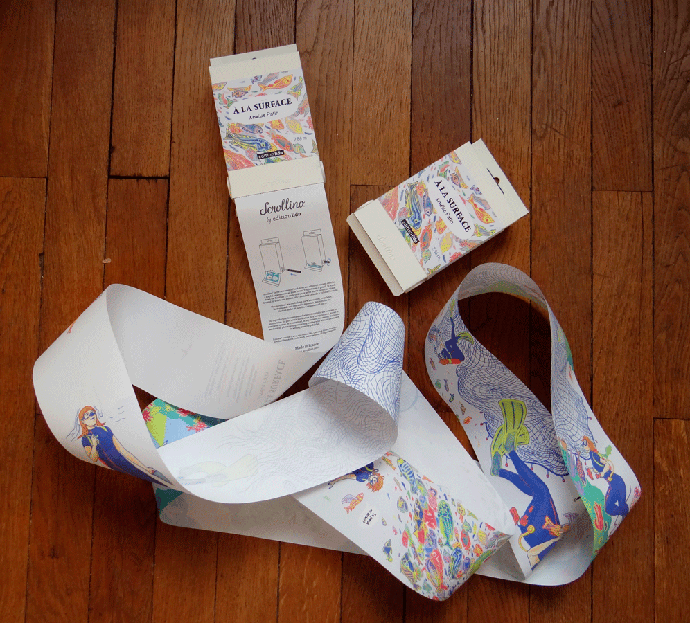 Voici les images et aperçus de À la surface, mon Scrollino édité chez Édition Lidu. Le Scrollino est un concept de leur invention de livre-objet déroulant, qui reprend le principe de défilement sur écran numérique. On peut donc, en tirant sur la languette, y lire une histoire de bas en haut. Mon histoire se déroule sur 286 cm.